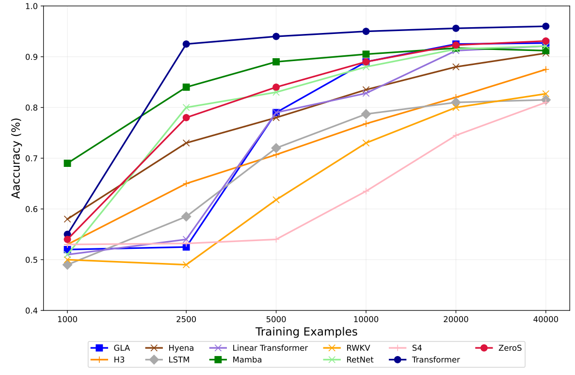 The results show that ZeroS closes the gap with softmax attention and performs competitively with other efficient methods such as Mamba and GLA: