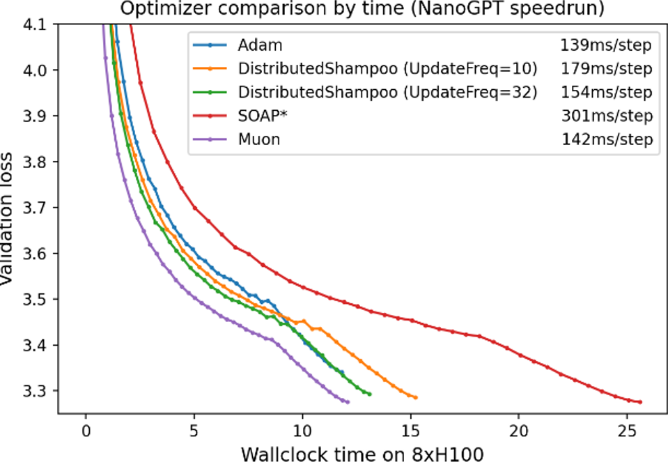 MUON improves validation loss compared to Adam for equal training time (Source: Muon: An optimizer for hidden layers in neural networks)